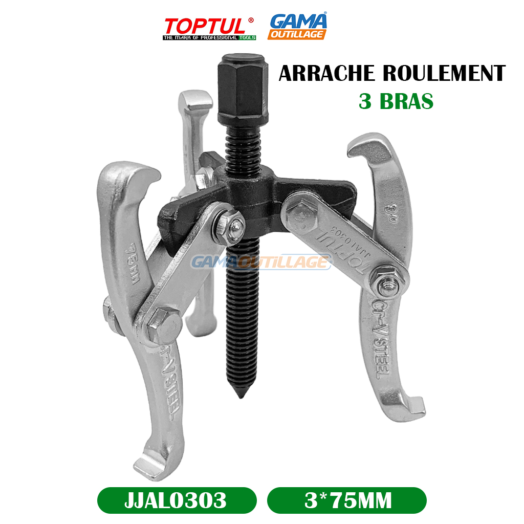 GAMAOUTILLAGE vous propose une ARRACHE ROULEMENT 3 BRAS 3*75MM TOPTUL, Extracteur d’engrenages à 3 mâchoires (Dénudeur à trois bras) avec largeur de travail jusqu’à 75mm. L’extracteur professionnel est fabriqué en acier inoxydable de haute qualité. Permet de démonter soigneusement les roulements sans les endommager et résiste à de lourdes charges.