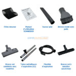Accessoires complets : Brosse sol, suceurs, rallonges métal, tous compatibles et faciles à monter.