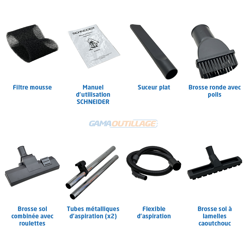 Aspirateur SCHNEIDER 1600W 50L. Filtre HEPA, soufflerie, cuve inox, accessoires inclus. Pour usage professionnel ou atelier. Disponible chez GAMA OUTILLAGE.