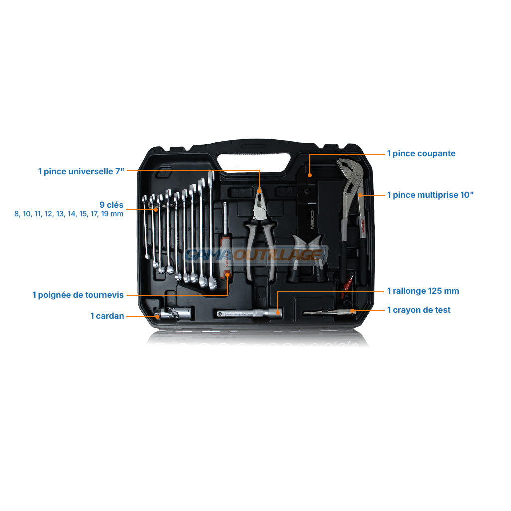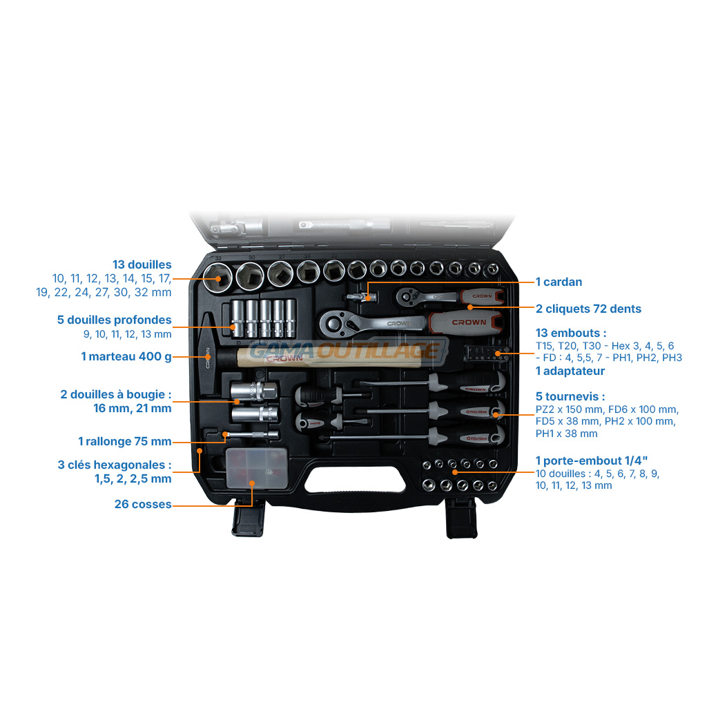 La caisse à douille 1/2″ 100PCS CROWN – CPHTS-XC100BA est un coffret complet regroupant douilles, clés, pinces, tournevis, embouts et accessoires indispensables pour les travaux de mécanique, maintenance, bricolage et interventions polyvalentes.