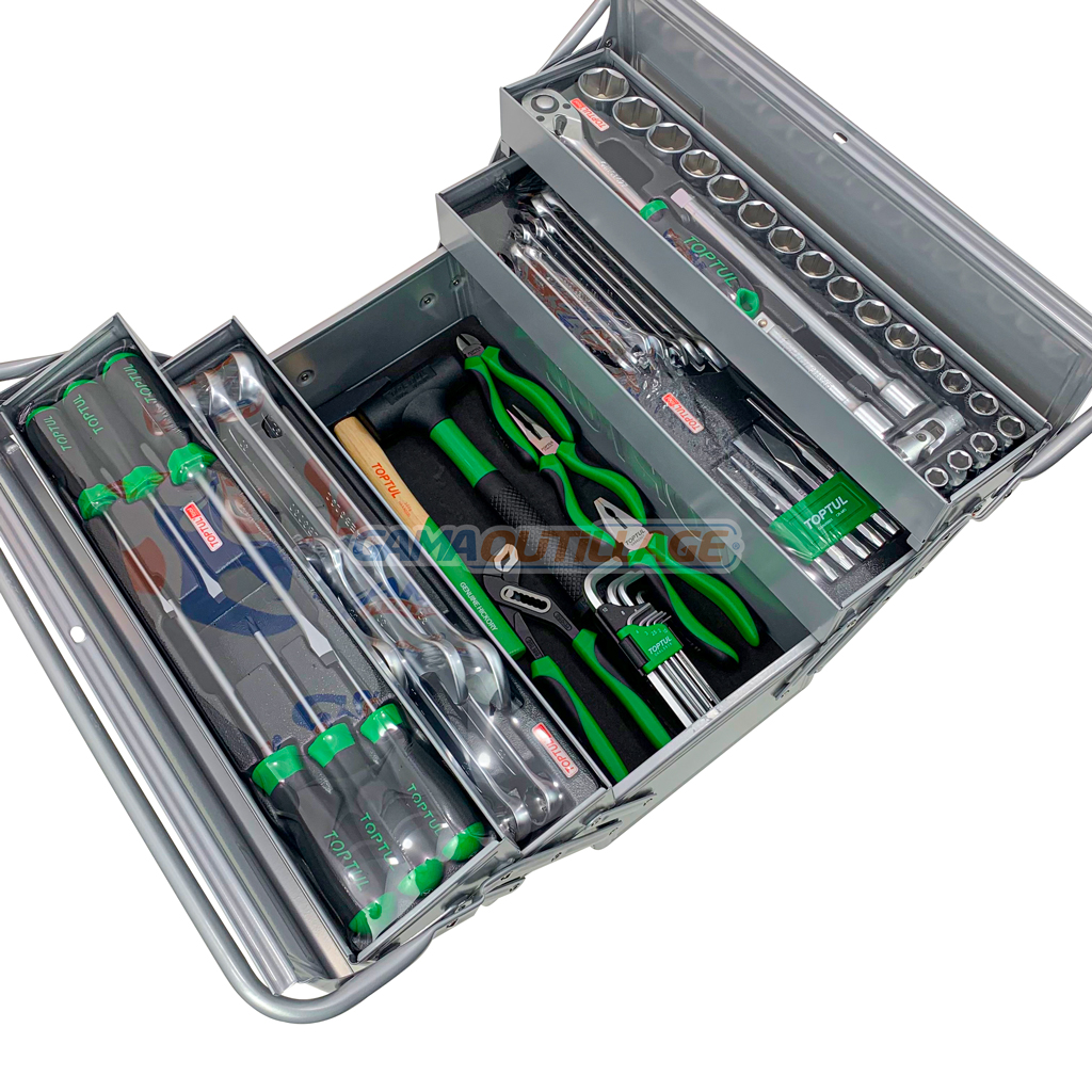 GAMAOUTILLAGE vous propose une CAISSE A OUTILS 63PCS TOPTUL, L’ensemble de coffre à outils 63PCS est un excellent choix pour les bricoleurs et les professionnels. Il contient une variété d’outils qui peuvent être utilisés pour une variété de tâches, y compris des tournevis, des clés, des douilles et des marteaux.