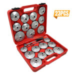 CAISSE CLE FILTRE A L’HUILE 23PCS WINMAX, est un ensemble d’outils conçu pour retirer et installer les filtres à huile des véhicules européens. Il comprend 23 clés de filtre à huile de différentes tailles, un adaptateur et un coffret de rangement.