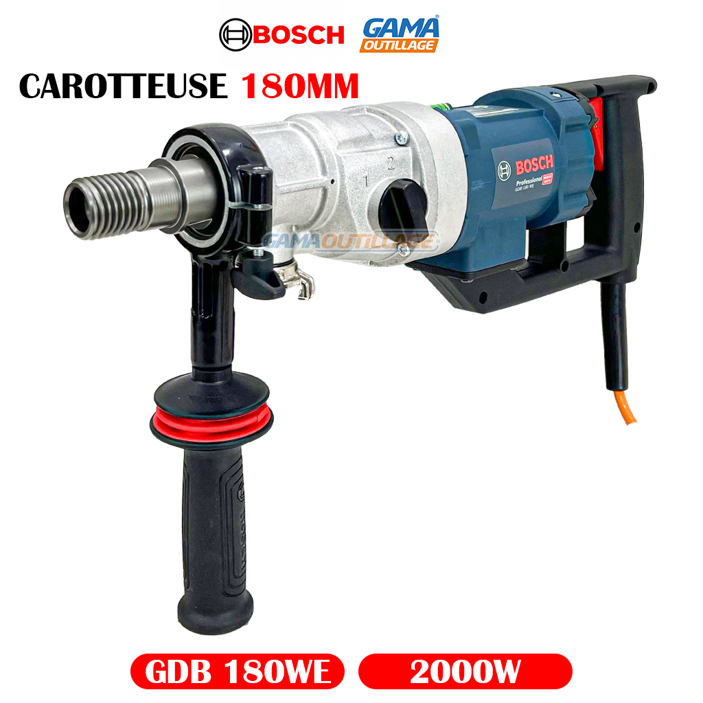 GAMAOUTILLAGE vous propose une CAROTTEUSE 180MM 2000W BOSCH, est un outil électrique professionnel utilisé pour réaliser des trous de grand diamètre dans différents matériaux, tels que le béton, la brique ou la pierre. Elle est équipée d’une couronne de forage, d’où son nom. La carotteuse 2000w a un condensé de puissance pour forer jusqu’à 180 mm. Sa Grande durée de vie grâce à la robustesse de conception et au réducteur à bain d’huile. GDB 180 WE a une Utilisation sur supports mouillés et secs, guidage à la main ou sur support ( fourni)