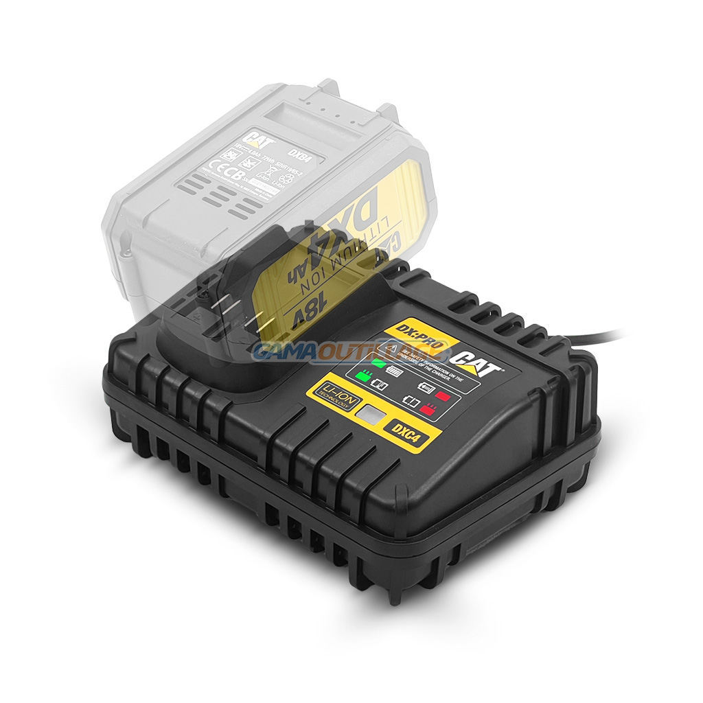 Chargeur rapide CAT DXC4 pour batteries 18V Lithium-Ion. Affichage LED, refroidissement actif, fixation murale, format compact. Disponible chez GAMA OUTILLAGE.