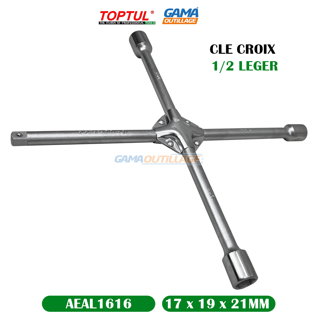 CLE CROIX 1/2 LEGER TOPTUL, est une clé à écrou de roue robuste à quatre voies. Elle convient à la plupart des camionnettes et camions et dispose d’hexagones d’entraînement à bride de 17, 19 et 21 mm et d’un entraînement carré de 11/2″.