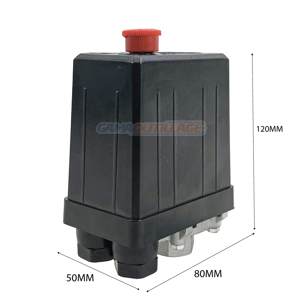 GAMAOUTILLAGE vous propose une CONTACTEUR COMPRESSEUR 1 SORTIE, est un dispositif électromécanique qui commande le démarrage et l’arrêt d’un compresseur d’air. Il est généralement activé par un pressostat qui surveille la pression d’air dans le réservoir du compresseur. Lorsque la pression baisse en dessous d’un certain seuil, le pressostat envoie un signal au contacteur, qui à son tour ferme les contacts électriques pour alimenter le moteur du compresseur. Une fois la pression désirée atteinte, le processus s’inverse.