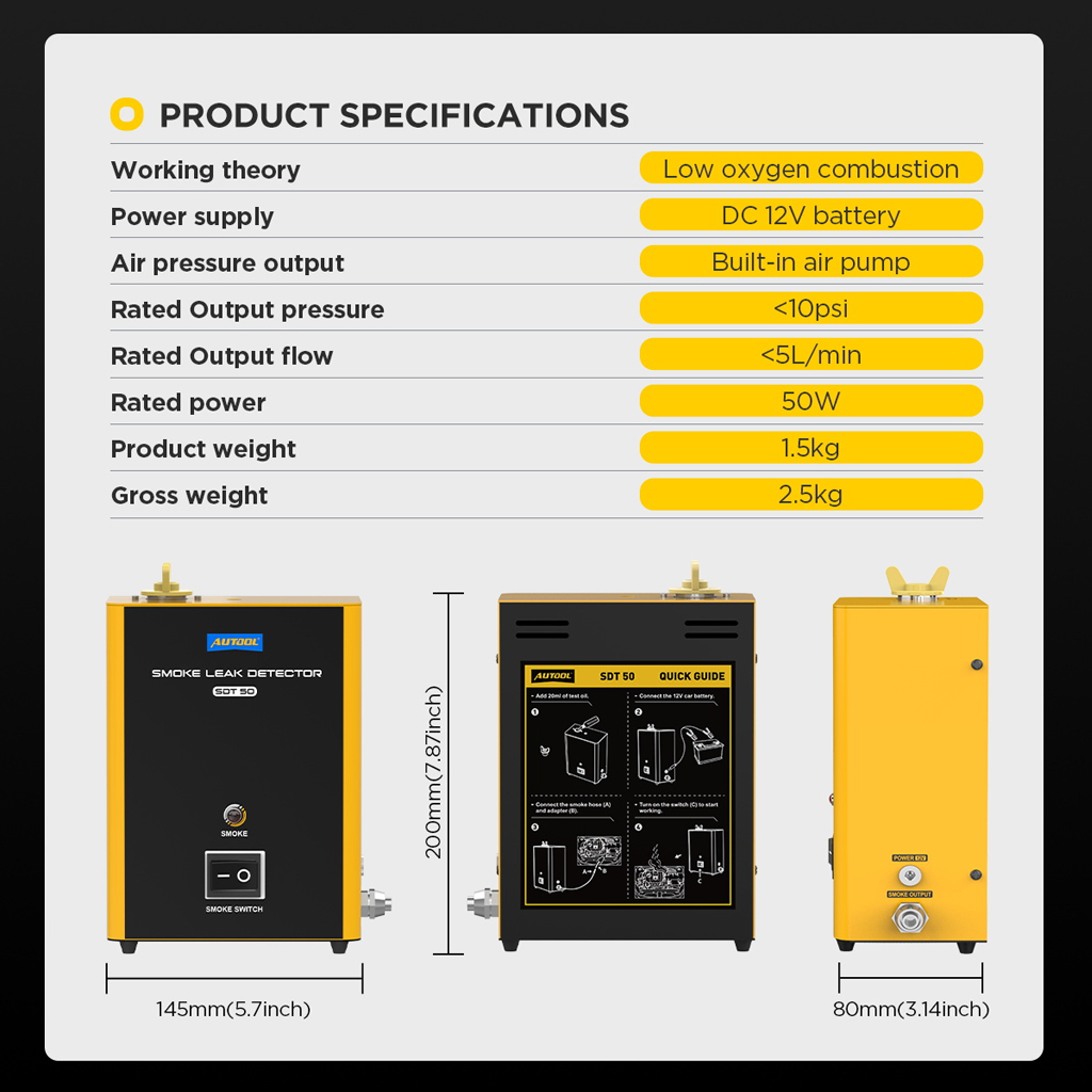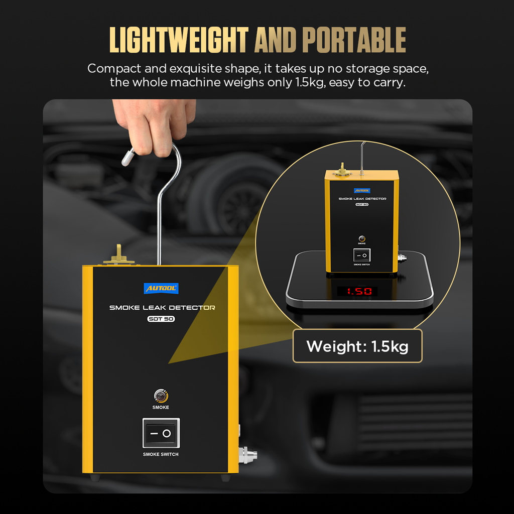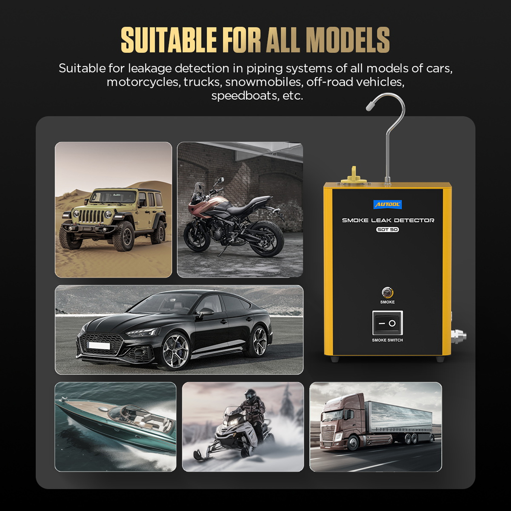 - Large gamme d’applications : le détecteur de fuite de fumée AUTOOL SDT50 convient à la détection de fuites dans les automobiles, les motos, les motoneiges, les VTT, les camions légers et les bateaux rapides, adapté à tous les modèles (uniquement pour 12 V CC).