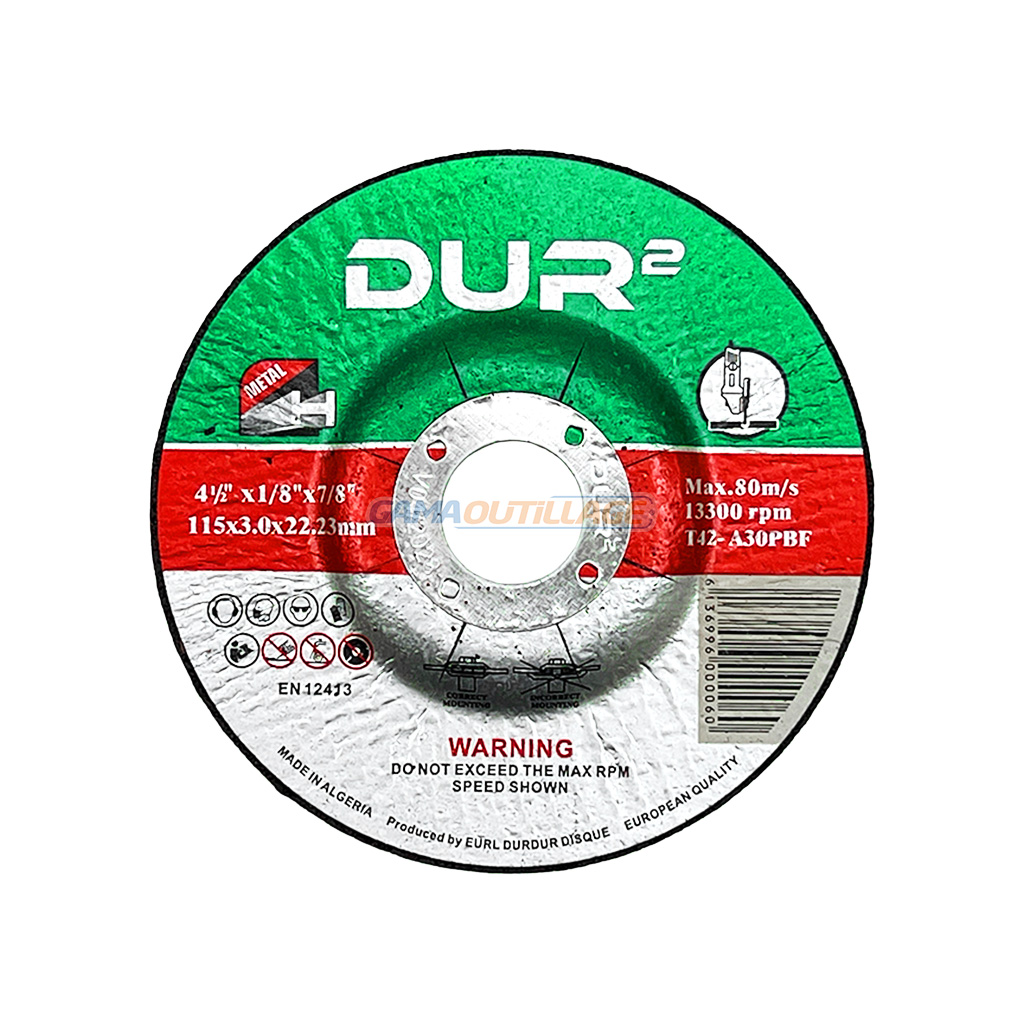Disque à couper métal DUR DUR 115 mm x 3.0 mm, vitesse max 13 300 tr/min, conforme EN12413. Pour coupe métal efficace. Disponible chez GAMA OUTILLAGE.