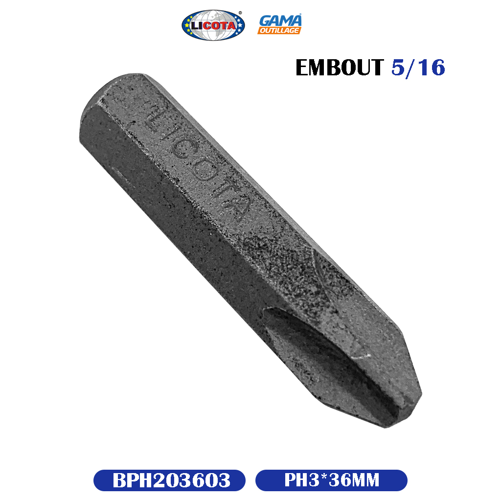 EMBOUT 5/16 PH3*36 MM, est un outil utilisé pour le vissage et le dévissage de vis. Il est compatible avec les tournevis et les visseuses ayant un entraînement hexagonal de 5/16pouce.