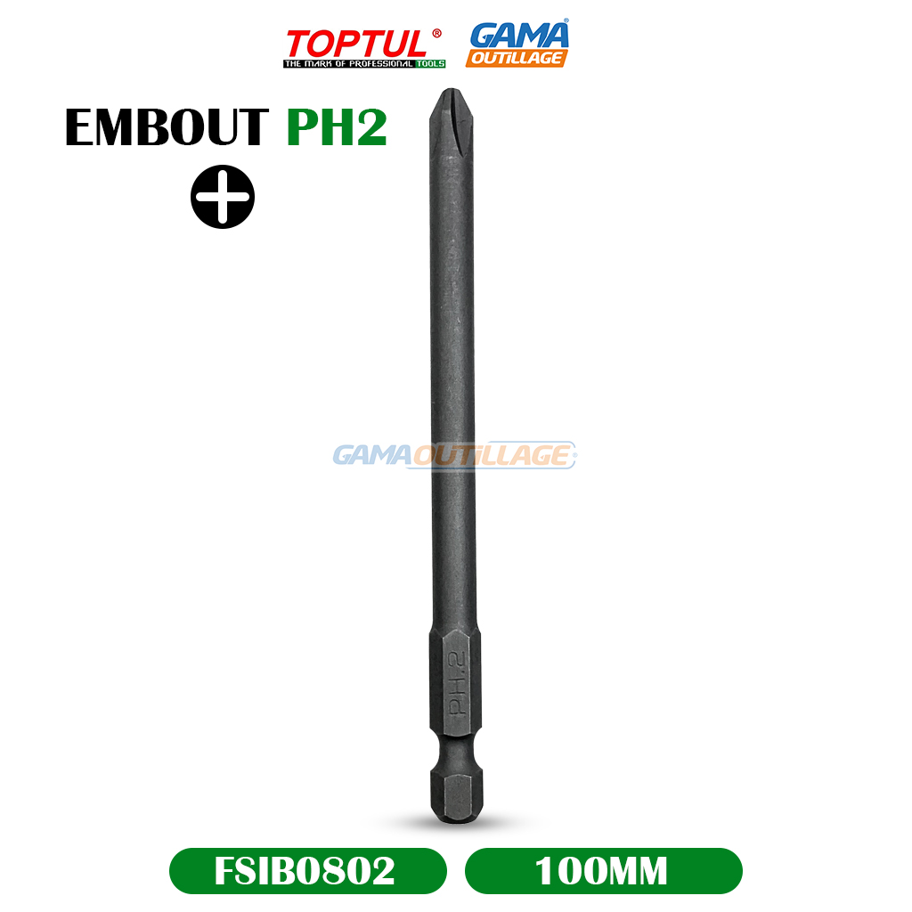 GAMAOUTILLAGE vous propose une EMBOUT PH2*100 MM TOPTUL, est un embout de tournevis électrique Phillips à tige hexagonale 1/4″ (100 mm) sont des accessoires utilisés pour visser et dévisser des vis Phillips. Ils sont composés d’une tige hexagonale de 1/4″ de diamètre, qui s’insère dans le mandrin d’un tournevis électrique, et d’une tête Phillips. La tête Phillips est la partie qui s’insère dans la tête de la vis et permet de la visser ou de la dévisser.