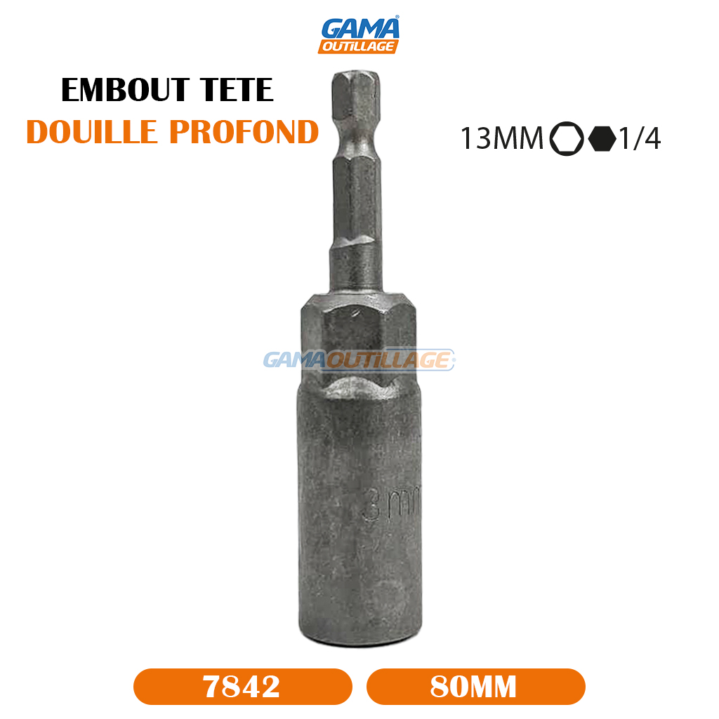 GAMAOUTILLAGE vous propose une EMBOUT TETE DOUILLE PROFOND 13MM TA, est un outil de vissage conçu pour atteindre les vis et les écrous situés dans des endroits difficiles d’accès, comme les profondeurs de mécanismes ou les zones étroites. La profondeur accrue de cet embout par rapport à un embout standard facilite grandement le travail, en particulier lorsque l’espace de manœuvre est limité.
