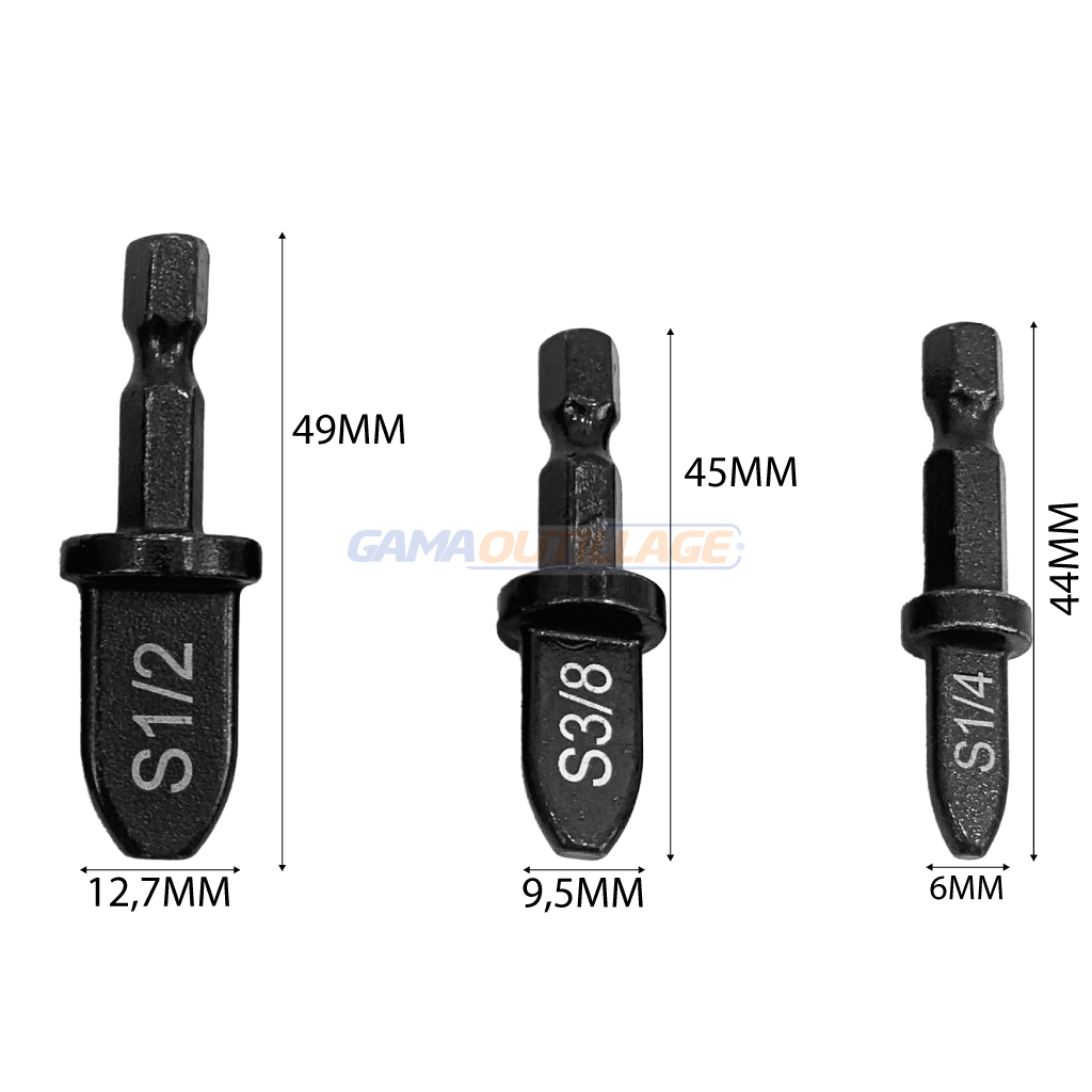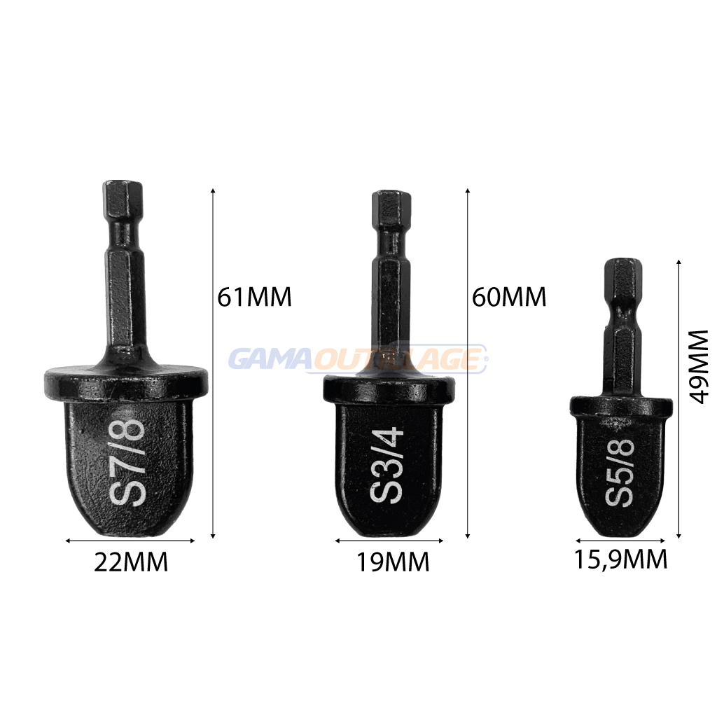 - Taille : 6 tailles différentes : 1/4” (6mm), 3/8” (9,5 mm), 1/2” (12,7 mm), 5/8” (15,9 mm), 3/4” (19 mm) 7/8” (22mm) peuvent répondre à vos différents besoins.