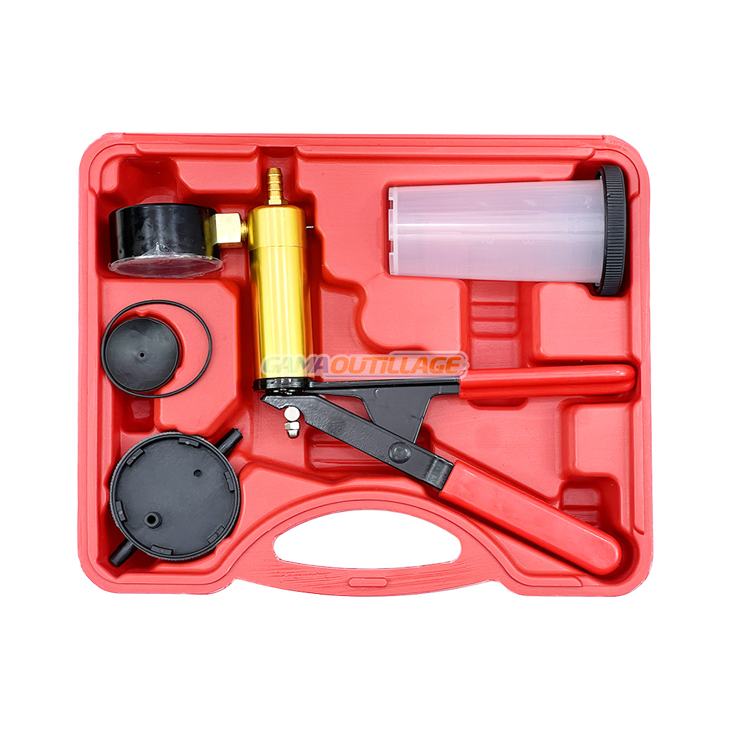 Le kit de purge de frein GA688 est conçu pour l’entretien et la purge rapide des systèmes de freinage et d’embrayage hydrauliques. Complet et prêt à l’emploi, il comprend une pompe à main avec manomètre intégré pour contrôler la pression ou le vide, des flexibles transparents, des adaptateurs multiples et un réservoir de récupération.