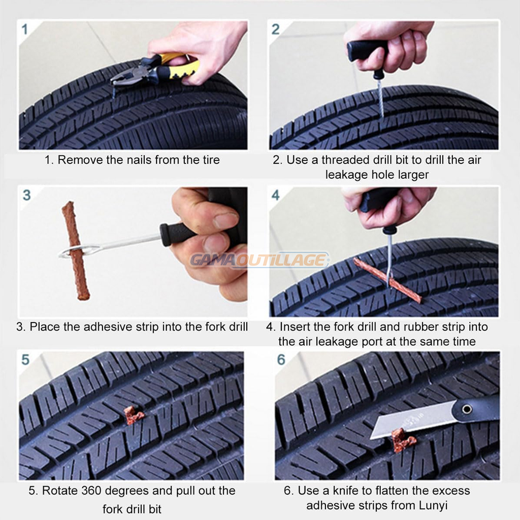 - Outil de voiture essentiel Ce kit de réparation de pneus de voiture est essentiel pour les véhicules équipés de pneus sans chambre à air, vous permettant de réparer rapidement et efficacement un pneu crevé et de reprendre la route en quelques minutes.