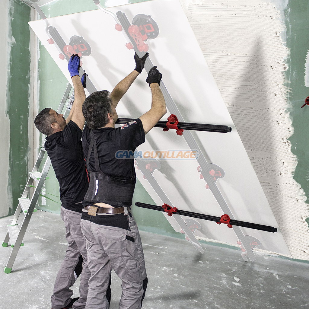 - Il est constitué d’un ensemble de deux profilés en aluminium extrudé, renforcés, rétractables et ajustables de 170cm et de deux traverses perpendiculaires qui favorisent la robustesse et la stabilité de l’ensemble, en particulier lors de la manipulation des pièces les plus lourdes.