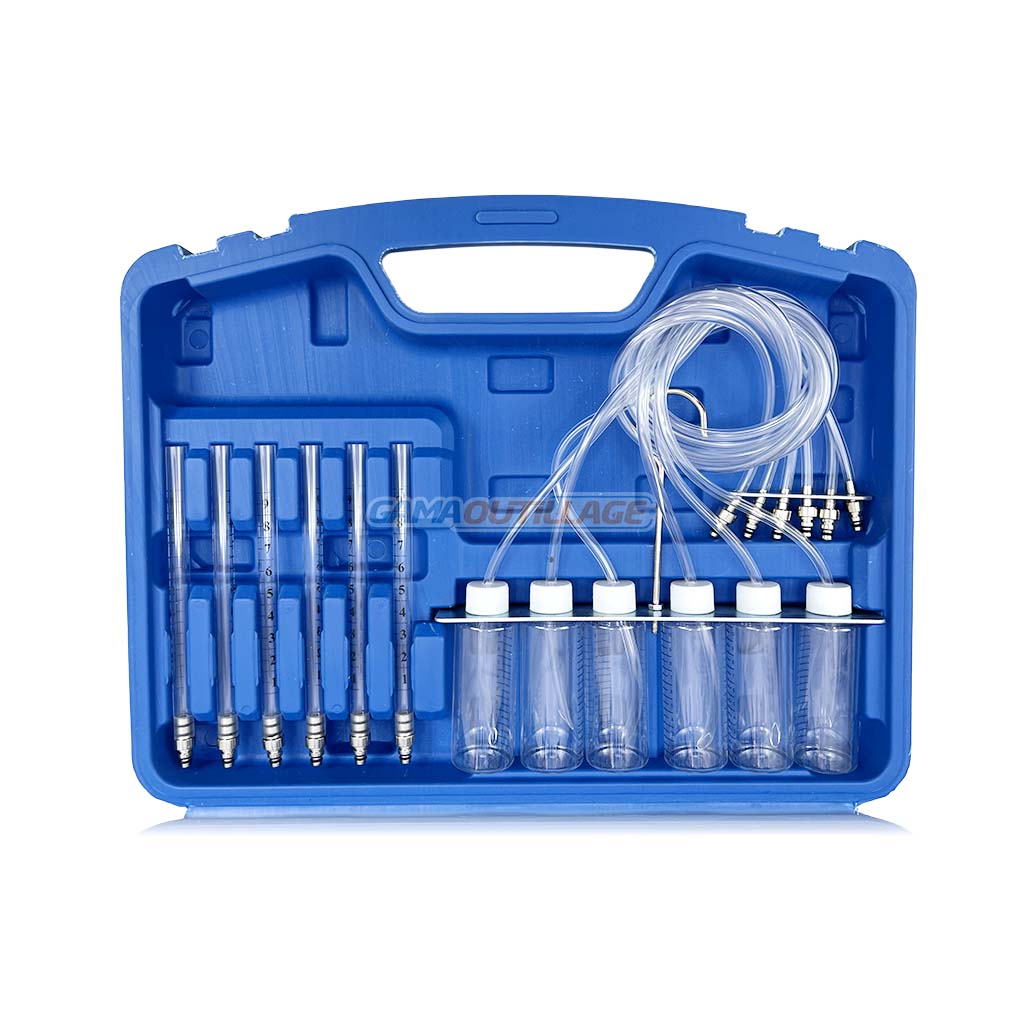 Kit testeur Common Rail pour injecteurs (Bosch, Siemens, Delphi, Denso). Mesure retour gasoil avec éprouvettes et flacons. 24 adaptateurs inclus.