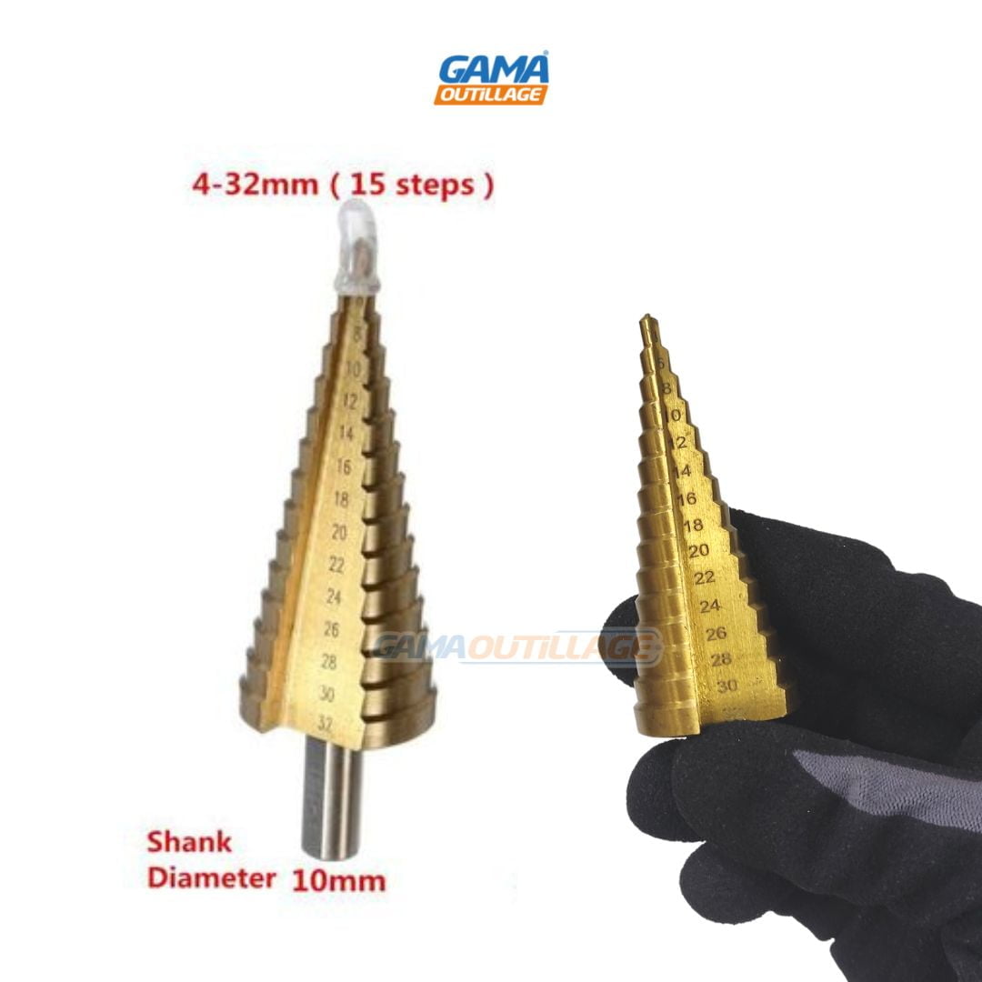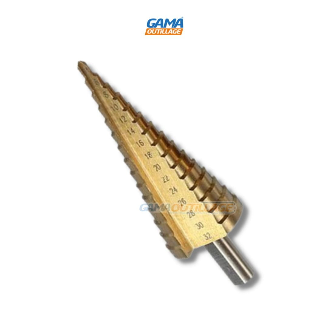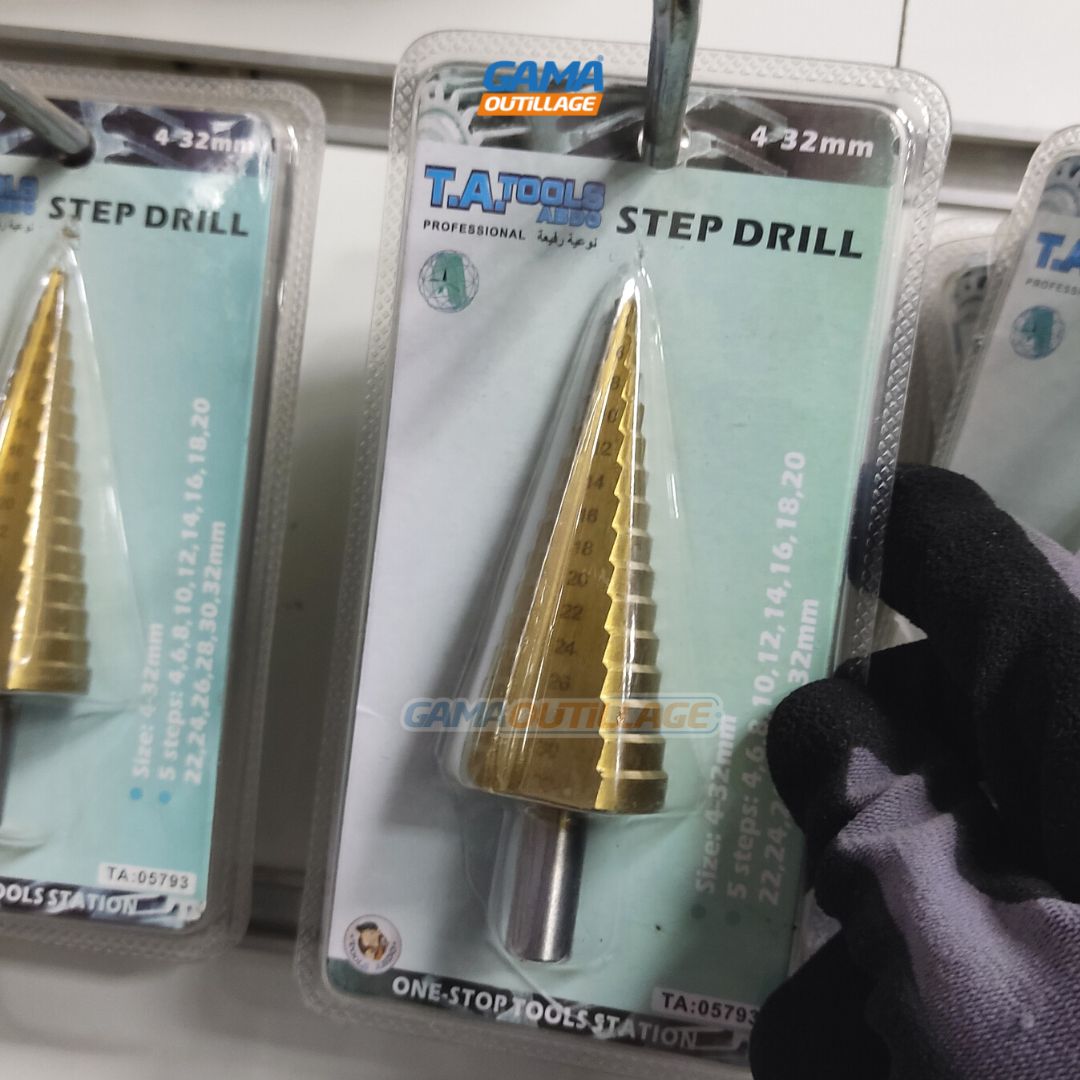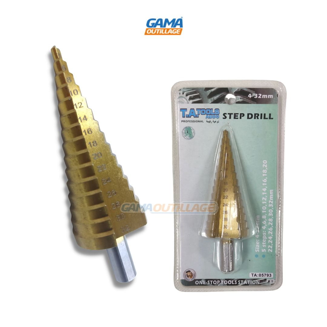 Le MECHE ETAGEE 4-32 du TA, est un Foret Fraise à Étage Conique en Acier HSS ø 4 à 32mm.