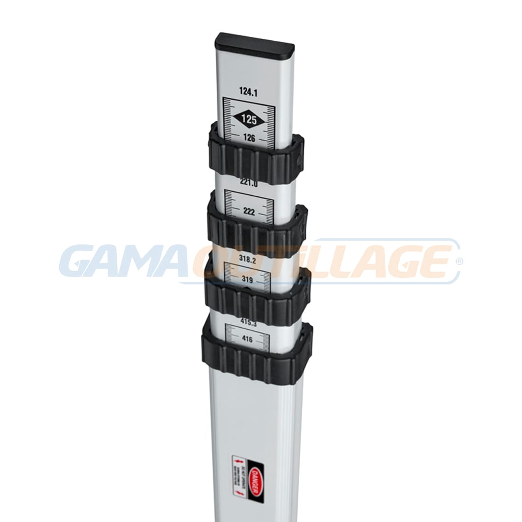 - Spécialement conçue pour un usage professionnel, elle est télescopique proposant une longueur de 5 m ajustable rapidement en 5 sections avec des clips pour stopper le coulissage et minimiser les écarts de précisions dus aux jeux.