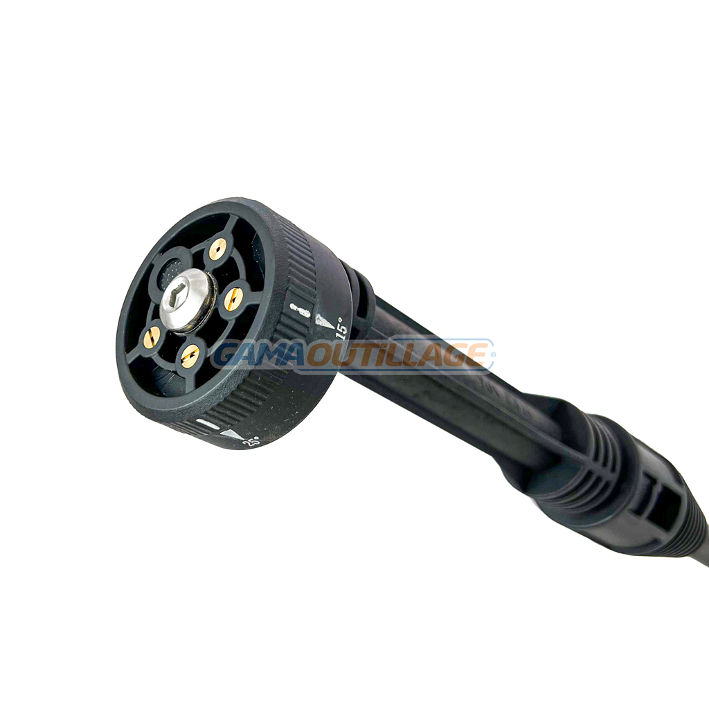 - Buse multi-jets avec commutation pratique de cinq types de jets qui vous permettent d’ajuster le débit d’eau et de l’adapter aux différentes surfaces et types de contamination.