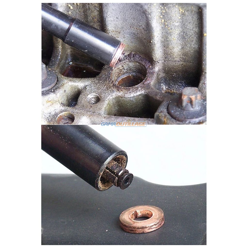 Ce OUTIL DEMONTAGE RONDELLE INJECTEUR est conçu pour être utilisé dans la plupart des injecteurs CDIl à rail commun pour retirer le joint en cuivre qui scelle le fond de l’injecteur. Le filetage pratique et la conception évasée conviennent à la plupart des véhicules utilisant l’injection Bosch CDI. À l’aide de cet outil spécial, le joint en cuivre peut être retiré et installé rapidement et efficacement sur l’injecteur diesel.
