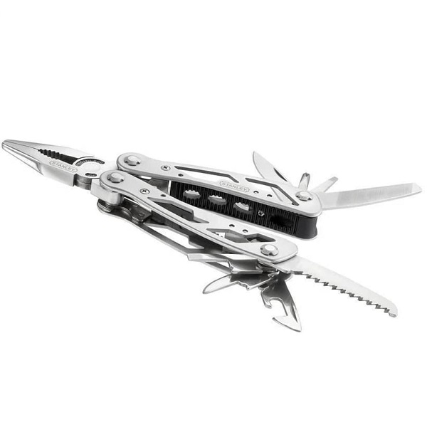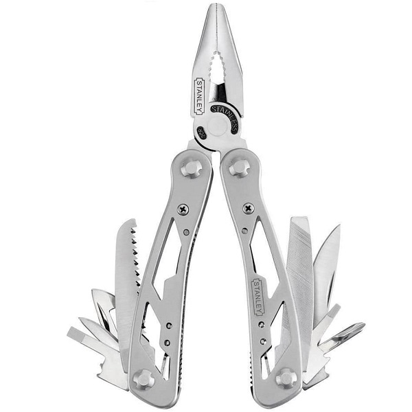 12 outils en 1: Pince universelle à bec dentelé, Pince coupe cables, Scie, Petit couteau, Grand couteau, Décapsuleur, Pince à bec coudé, Tournevis plat 3mm, Tournevis plat 6mm, Tournevis plat 8mm, Tournevis Phillips, Lime