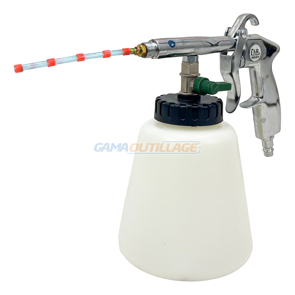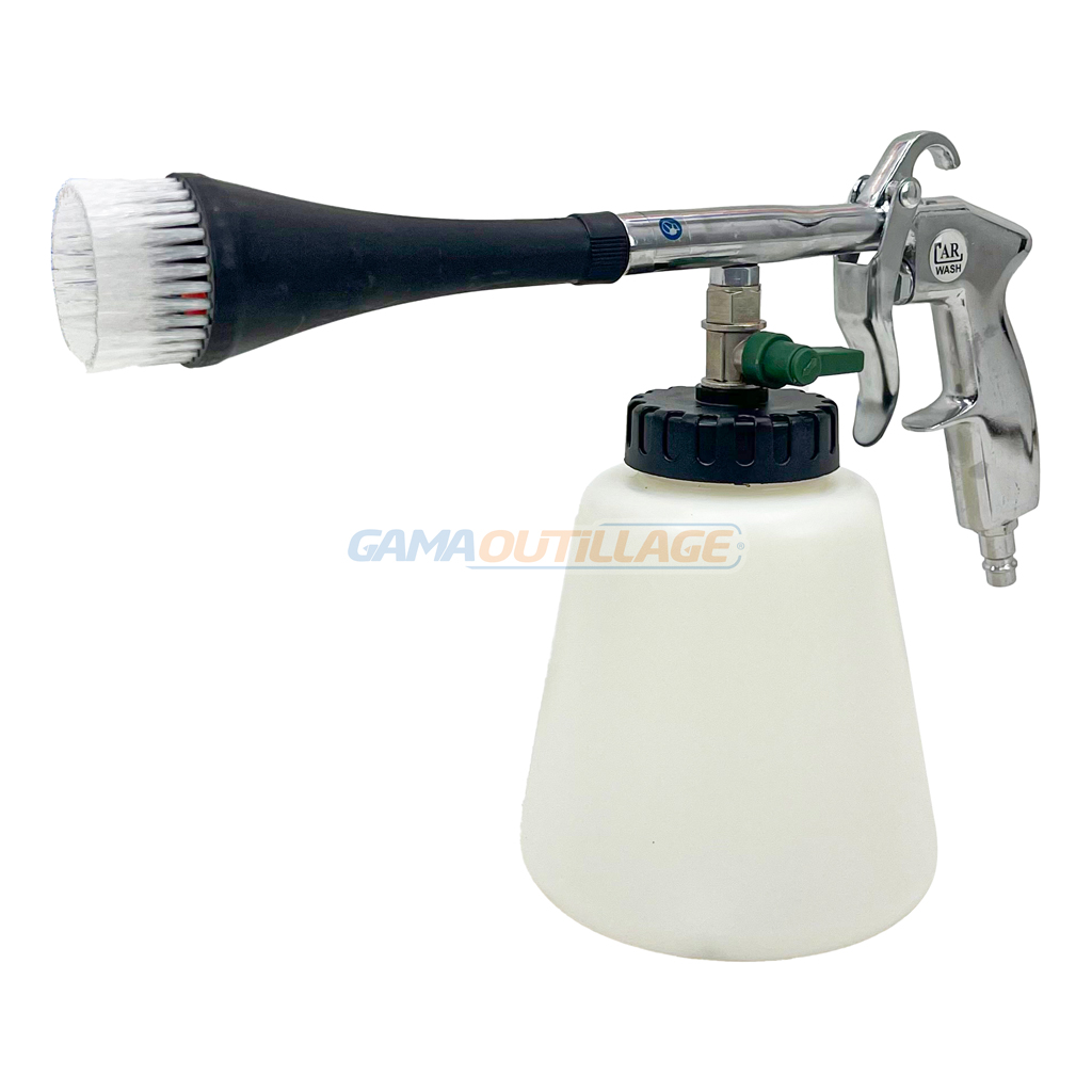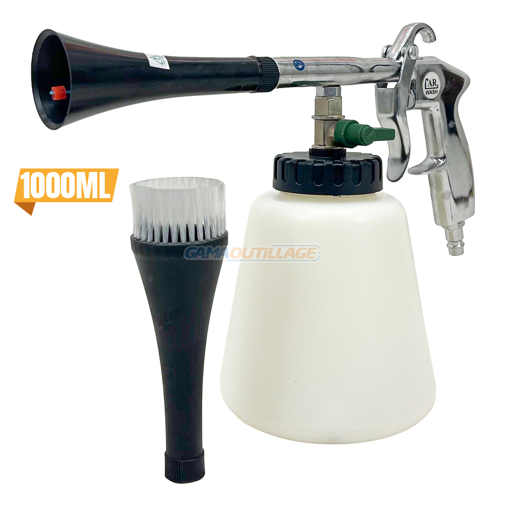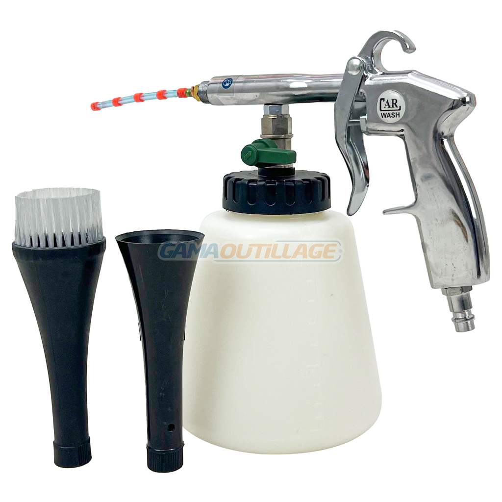 GAMAOUTILLAGE vous propose une PISTOLET DE NETTOYAGE PNEUMATIQUE TORNADO, aussi appelé pistolet Tornador ou pistolet de nettoyage type tornador, est un outil pneumatique conçu pour le nettoyage en profondeur de diverses surfaces, notamment les intérieurs de véhicules. Il utilise un flux d’air comprimé combiné à un produit de nettoyage pour créer un effet de tornade qui déloge la saleté et la crasse.