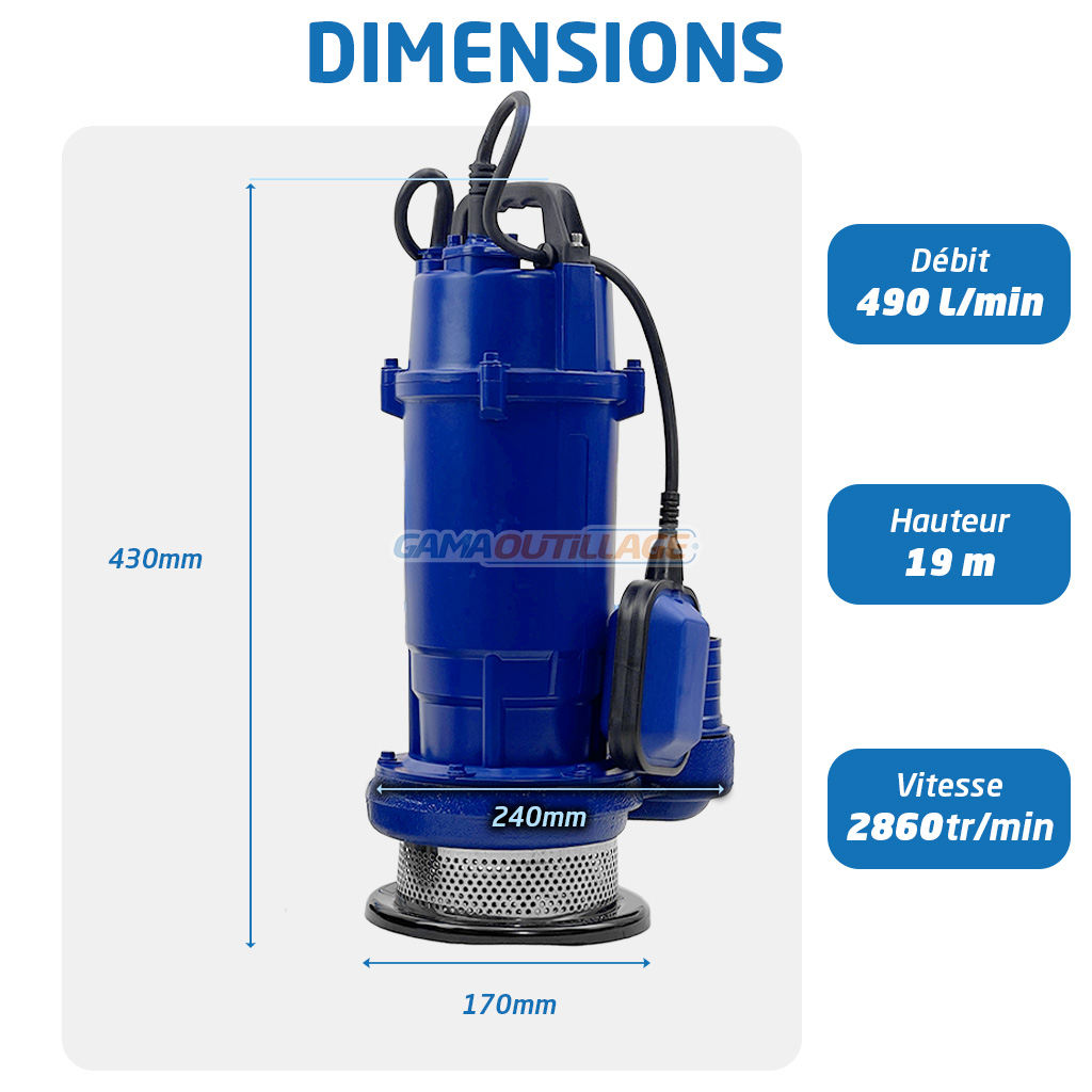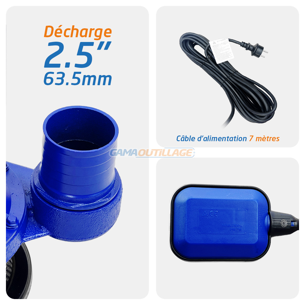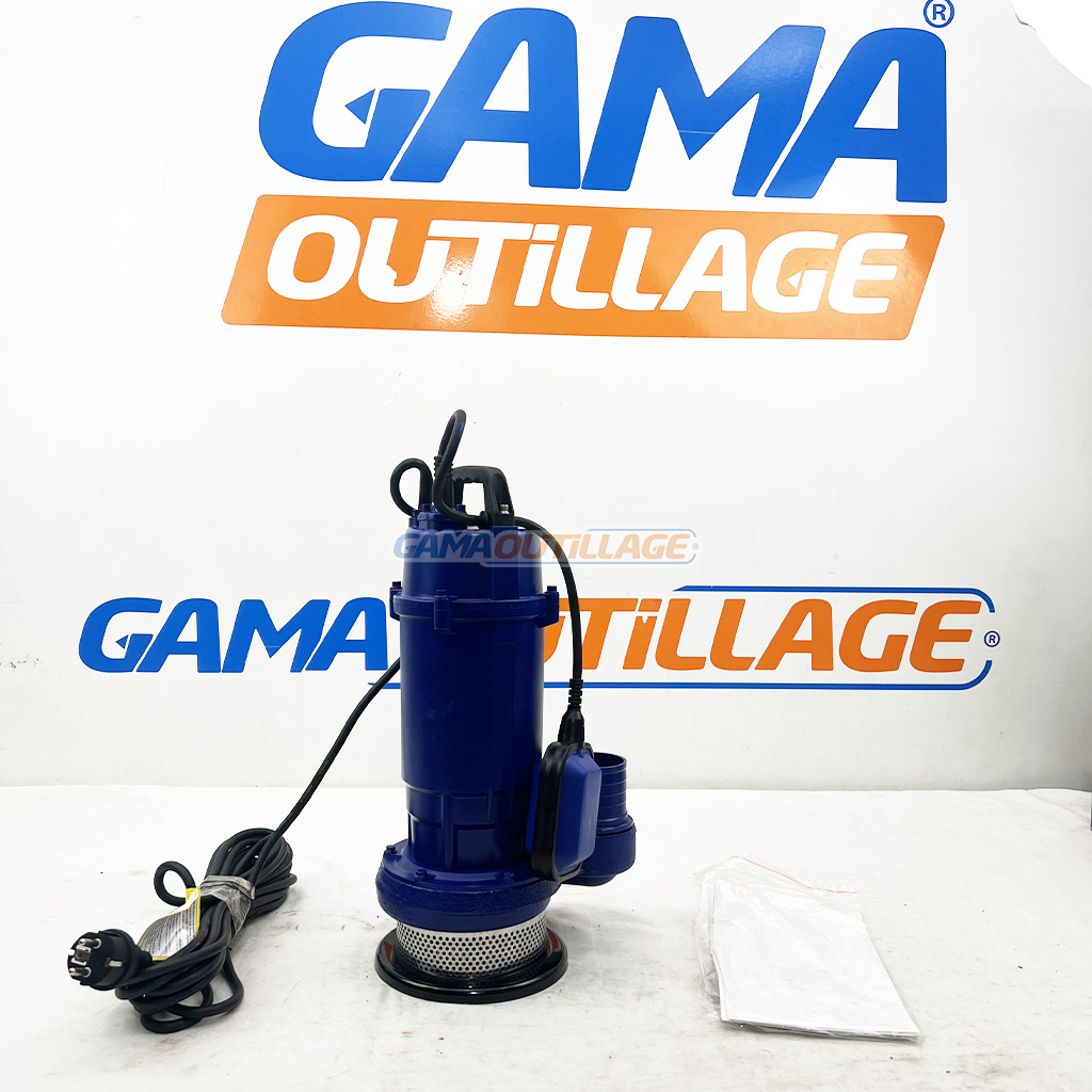 Pompe submersible HAPPY 1.5HP – Débit 490 L/min, hauteur 19 m, sortie 2.5″. Corps fonte/acier, flotteur automatique, câble 7 m. Chez GAMA OUTILLAGE.