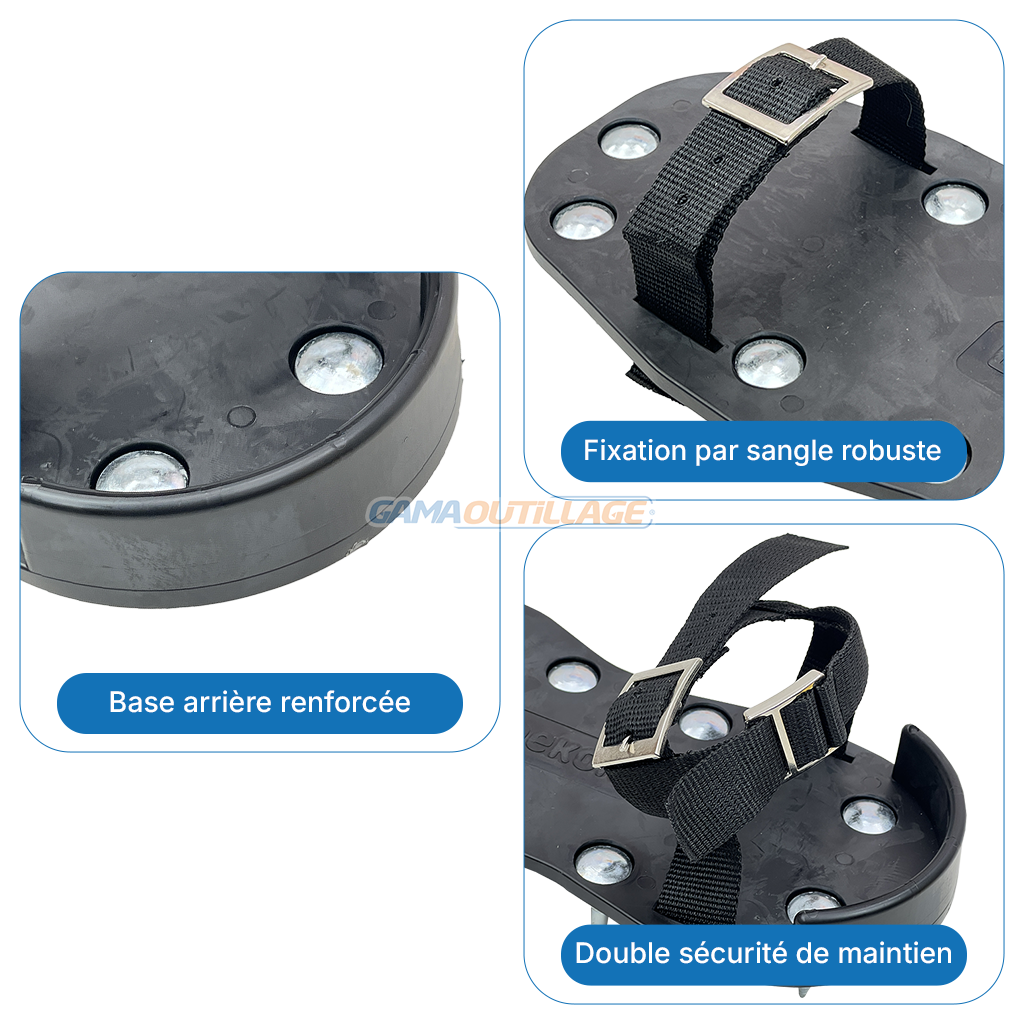 Chaque semelle est équipée de 13 pointes en acier époxy soigneusement vissées, assurant une excellente accroche sur les surfaces humides ou en cours de séchage. Leur base en plastique rigide répartit efficacement le poids et évite l’enfoncement, garantissant un rendu propre du sol.
